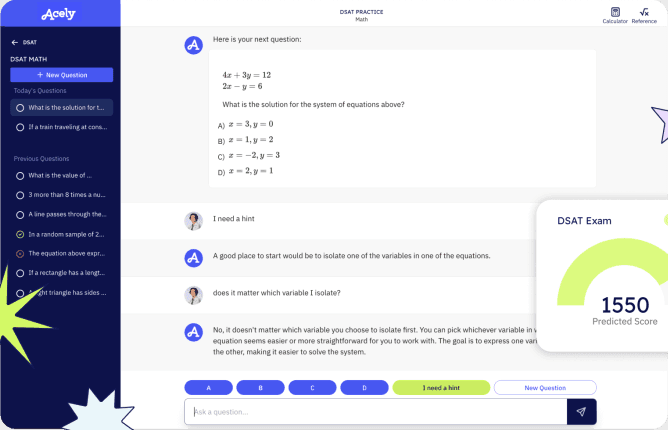"Acely.ai excels in SAT preparation with its advanced AI-driven study system, providing personalized study plans, 4000+ practice questions with hints & explanations powered by AI, realistic adaptive exams, and detailed performance analytics. Our platform offers a tailored approach to optimize student performance and prepare effectively for the SAT."
